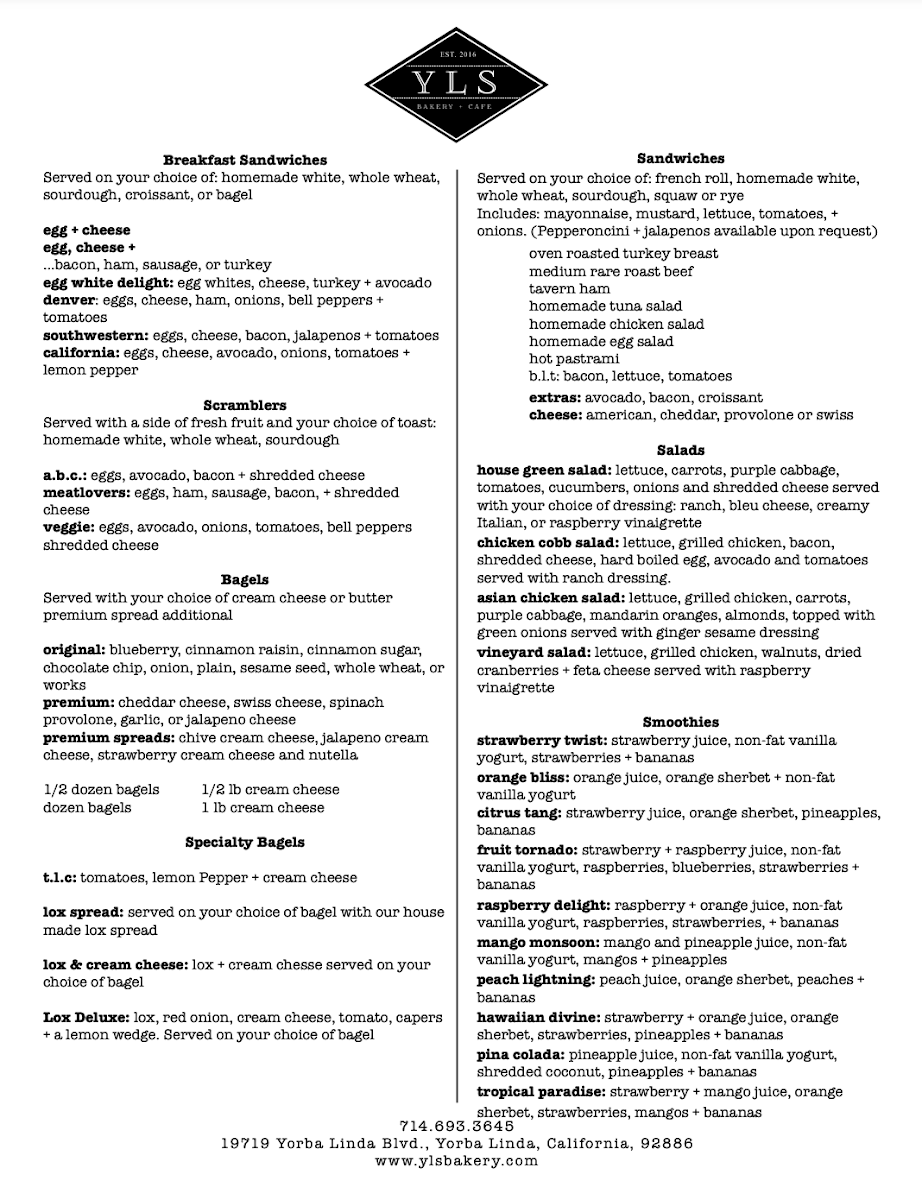 Welcome to YLS Bakery & Cafe, a charming spot located at 19719 Yorba Linda Blvd, CA, perfect for those seeking delightful flavors and a warm atmosphere. The menu here is nothing short of enticing, featuring a range of fresh-baked goods and gourmet options.